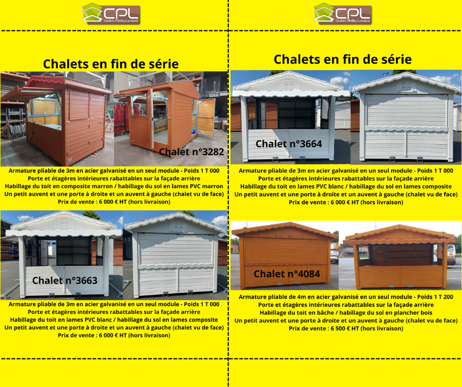 Vente Chalets Pliables CPL : Profitez de nos Fins de Série ! Optimisez vos événements avec nos chalets pliables CPL, la référence du mobilier événementiel professionnel. Pour faire place à nos nouvelles collections, nous liquidons nos derniers stocks en fin de série à des prix imbattables. Pourquoi choisir le chalet pliable CPL ? Le système CPL est reconnu pour sa robustesse et son ingéniosité. Que vous soyez une collectivité ou un organisateur d’événements, ces chalets offrent des avantages uniques : Montage express : Une structure pliable qui permet une installation en quelques minutes sans outils lourds. Gain de place : Une fois repliés, ils occupent un volume minimal pour un stockage et un transport facilités. Qualité Professionnelle : Conçus pour résister aux intempéries et aux montages répétés. Une opportunité rare : Déstockage limité Saisissez l’occasion d’acquérir des chalets de vente d’occasion en fin de série. C’est la solution idéale pour vos marchés de Noël, buvettes éphémères ou points d’information touristique à moindre coût. Attention : Les stocks sont limités. Nos chalets pliables CPL sont disponibles à l’unité ou en lot, avec une livraison possible partout en France.