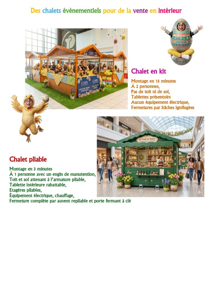Boostez vos Ventes de Chocolats de Pâques : Le Chalet Événementiel d’Intérieur. Le chocolat est le roi de la fête de Pâques, mais sa présentation fait toute la différence. Pour vos opérations en galeries marchandes, halls d’hôtels ou salons professionnels, nos chalets pliables CPL offrent un écrin premium et rassurant pour vos créations artisanales. Une Boutique Éphémère « Chocolaterie » en 5 Minutes. En intérieur, la rapidité d’installation est cruciale pour ne pas perturber le passage des clients. Grâce au système CPL, votre stand de vente est opérationnel en 5 minutes chrono. Montage propre : Pas de poussière, pas de bruit de perceuse, idéal pour les centres commerciaux. Format compact : Une emprise au sol optimisée pour s’intégrer parfaitement dans les allées sans gêner la circulation. Pourquoi choisir le bois pour vendre du chocolat ? Le plastique et beaucoup de métal sont froids ; le bois évoque l’artisanat, la tradition et la gourmandise. Image de Marque : Le chalet en bois valorise le travail du chocolatier et justifie un positionnement haut de gamme. Modularité : Installez facilement vos tablettes présentoirs pour créer des pyramides d’œufs de Pâques, de lapins en chocolat et de fritures. Sécurité : Contrairement à une table ouverte, le chalet permet de fermer votre stock à clé lors des pauses ou à la fermeture du centre commercial. L’Atout Hygiène et Conservation, En intérieur, la température est stable. Le bois de nos chalets CPL agit comme un régulateur naturel, évitant les reflets directs des spots lumineux agressifs sur vos chocolats, préservant ainsi leur brillance et leur croquant. Déstockage de Printemps : Saisissez nos derniers chalets d’intérieur en location. Une solution rentable, réutilisable pour Noël, et immédiatement disponible pour votre campagne de Pâques 2026.